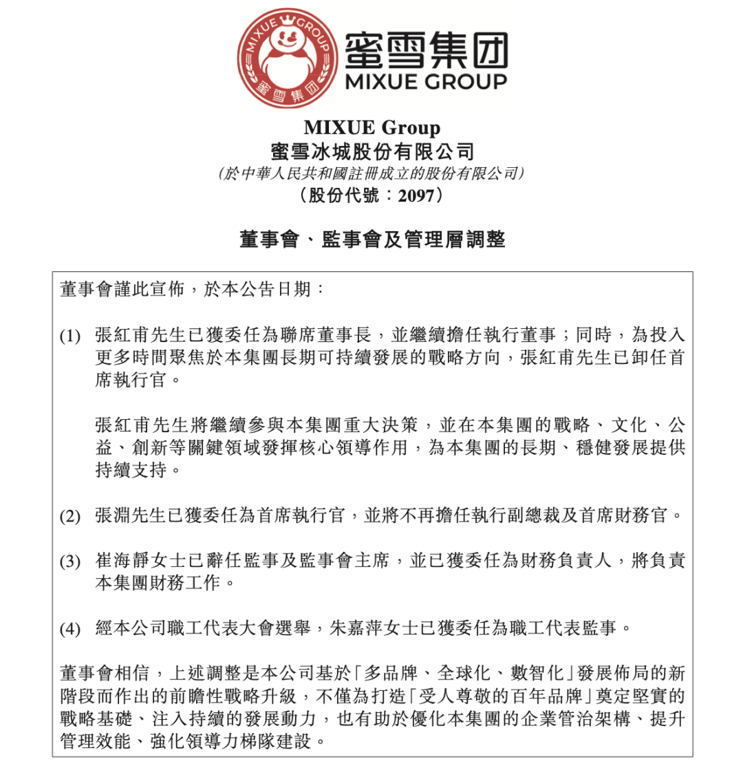 这场人事更替,表面上是一次CEO换届。但如果把它放进蜜雪二十多年的历史坐标里看,它更像是一次物种变异的信号——一家靠兄弟情义和街头直觉长大的公司,开始尝试用金融语言和数据逻辑来重写自己的操作系统。