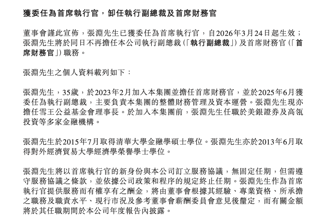 蜜雪冰城的公告里有一句不太起眼的话:“张渊将以首席执行官的新身份与本公司订立服务协议,无固定任期。“无固定任期——这七个字给了新任CEO足够的操作空间,同时也保留了如果效果不达预期时的调整余地。它的潜台词是:我们信任你,但我们也在看。