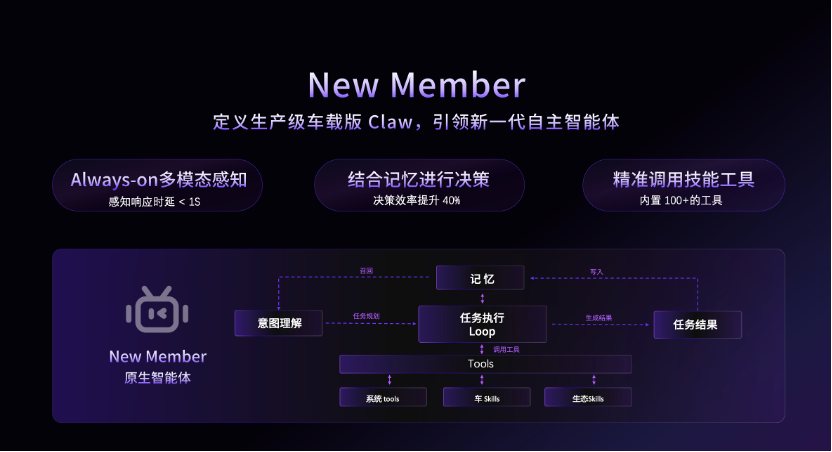 真正把这件事落地的是New Member。New Member是商汤绝影SageBox千机智盒的执行层原生智能体,作为车载版“Claw”,它是连接“思考层”与真实场景的关键桥梁,为车载自主智能体提供从感知到执行的全链路闭环能力。