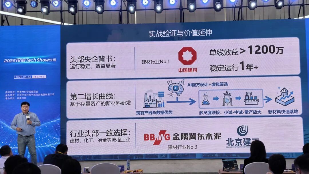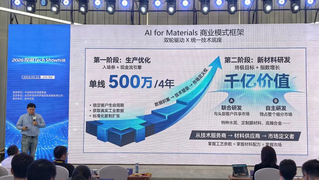“2026投海Tech Show”路演现场,素源矩阵AI for Materials商业模式框架,图源:「甲子光年」现场拍摄