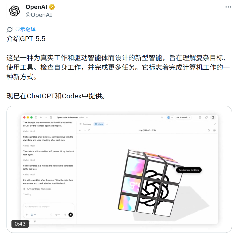 4月24日,OpenAI发布新一代旗舰模型GPT-5.5,并在其官网写道,是其迄今为止最智能、最直观易用的模型,也是在计算机上完成工作的新方式的下一步。