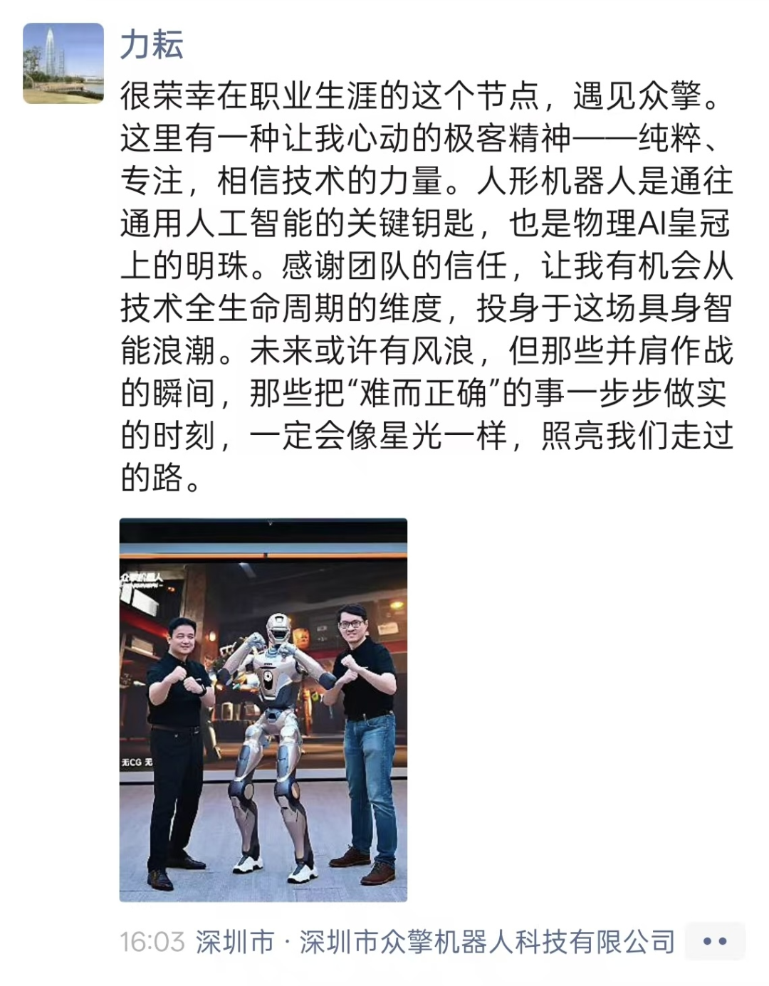 其实答案就藏在李力耘的朋友圈里。他写众擎有一种"让我心动的极客精神——纯粹、专注,相信技术的力量"。