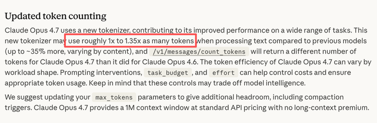 最先被注意到的,是同样的代码跑起来开始烧更多的钱。2026 年 4 月,Anthropic 发布 Claude Opus 4.7,官方公告里有一行小字:新模型采用了全新的分词器,“相同文本最多消耗 35% 更多的 Token”。Opus 4.7 和 4.6 的定价完全一致,输入 $5/百万 Token,输出 $25/百万 Token。
