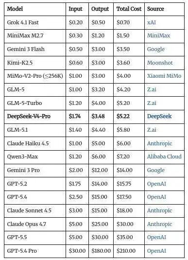 把价格拉出来对比,差距大到让人无法忽视。简单算一笔账:同样处理一百万输入 token 和一百万输出 token,GPT-5.5 的合计成本是 35 美元,Claude Opus 4.7 是 30 美元。而 DeepSeek-V4-Pro 是 5.22 美元。如果输入命中缓存,输入价格进一步降至每百万 token 0.145 美元,同样这笔账就变成了 3.625 美元。