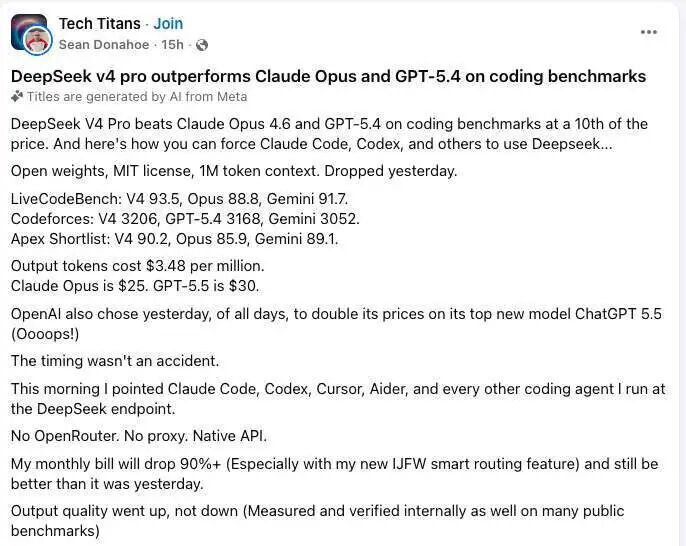 这条帖子实际上有两个看点。第一,发帖人是重度 AI 编程用户,却几乎一夜之间完成迁移,月账单会从几千美元降到几百美元。第二,他不只是说便宜,还强调效果没有变差,反而更好:“输出质量提高了,而不是下降,这一点已经通过内部测试以及多个公开基准验证”。“DeepSeek V4 Pro 在编码基准测试中击败了 Claude Opus 4.6 和 GPT-5.4...... 今天早上,我把 Claude Code、Codex、Cursor、Aider,以及我用的所有其他编程智能体全部指向了 DeepSeek 端点。不用 OpenRouter,不用代理,原生 API。我的月账单将下降 90% 以上,而且效果比昨天还好。”