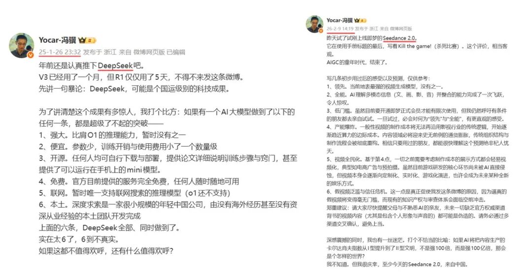 1月下旬至春节前,以“龙虾”为标志的Agent——OpenClaw、字节的视频模型Seedance 2.0相继爆火。曾为DeepSeek给出高度评价的OpenAI联合创始人安德烈·卡帕西(Andrej Karpathy)、打造出《黑神话:悟空》的游戏科学创始人冯骥,以类似的风格分别给予了新事物极大赞许。