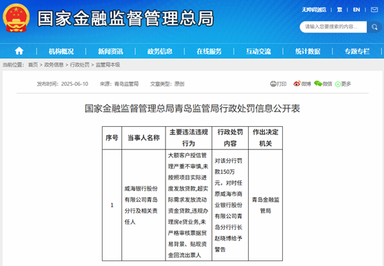 2026年1月6日,威海银行潍坊分行因违规发放无实际用途贷款、虚增存贷款规模被罚35万元;2025年6月,威海银行青岛分行由于大额客户授信管理严重不审慎,未按照项目实际进度发放贷款等多项违规,被罚款150万元,时任原威海市商业银行青岛分行行长赵晓博被给予警告。