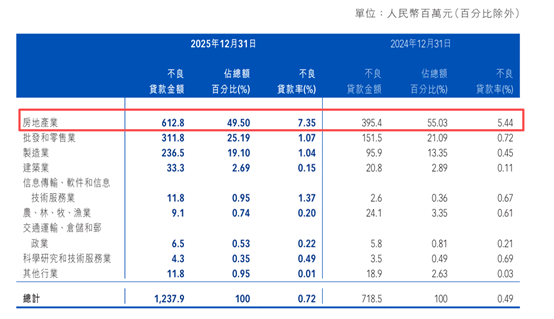 部分行业的不良贷款及不良贷款率值得关注。数据显示,截至2025年末,该行房地产业不良贷款余额6.12亿元,较上年末增长54.98%,不良贷款率也由上年末的5.44%升至7.35%。