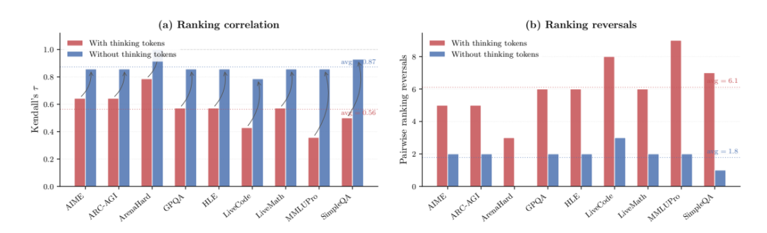 图 5: 从实际成本计算中去除思考 token 成本。(a) 标价排名与实际成本排名之间的相关性在所有任务中均显著提高。(b) 成对排名逆转数平均减少 70%。