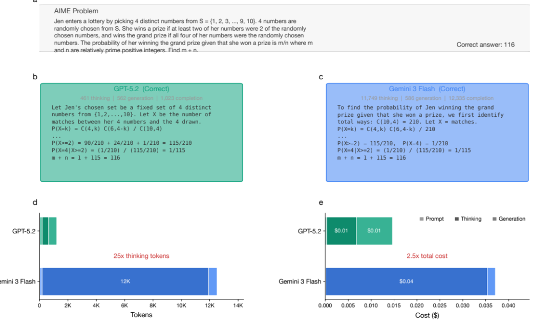 图 4: 在同一道 AIME 题目上,GPT-5.2 使用 562 个思考 token,而 Gemini 3 Flash 使用超过 11,000 个,导致实际成本高出 2.5 倍。