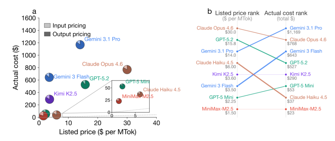 图 2: 实际成本排名在不同任务之间存在显著差异。测试发现:定价排名与实际成本排名的巨大反差,且这样的价格逆转是普遍存在的。根据固定标价 API 定价进行的标准评估是具有误导性的。