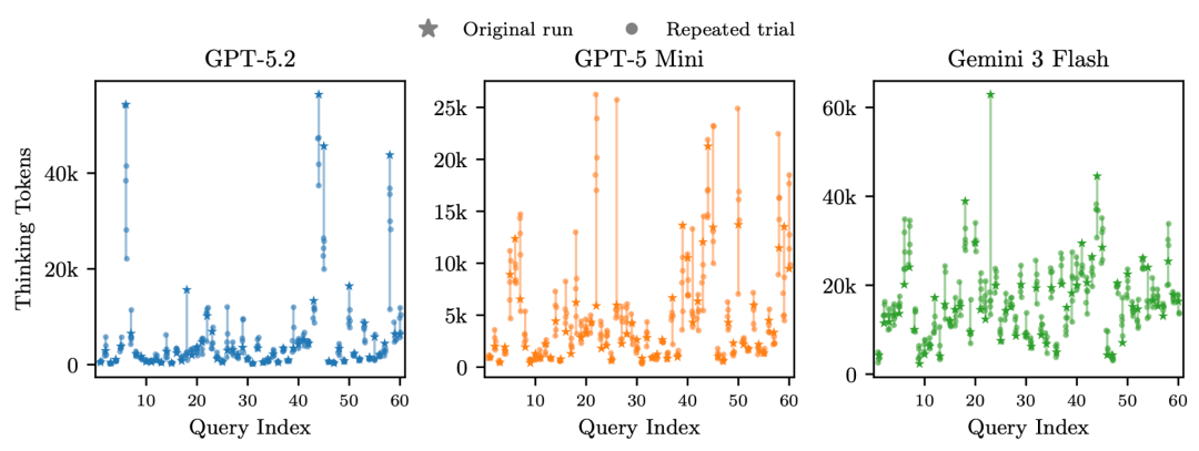 如图 5 所示,研究人员在数学竞赛数据集上多次运行同一个模型,发现它们的推理 token 的数量差距巨大。例如,对第 6 个任务,GPT-5.2 的推理 token 数最大可达五万,最低只需 2 万,达到了 2.5 倍的差距。这就意味着,推理 token 数本身带有巨大的随机性,因此,推理 token 数具有高度的不确定性和不可预测性,从而让实际开销的预测变得极为困难。