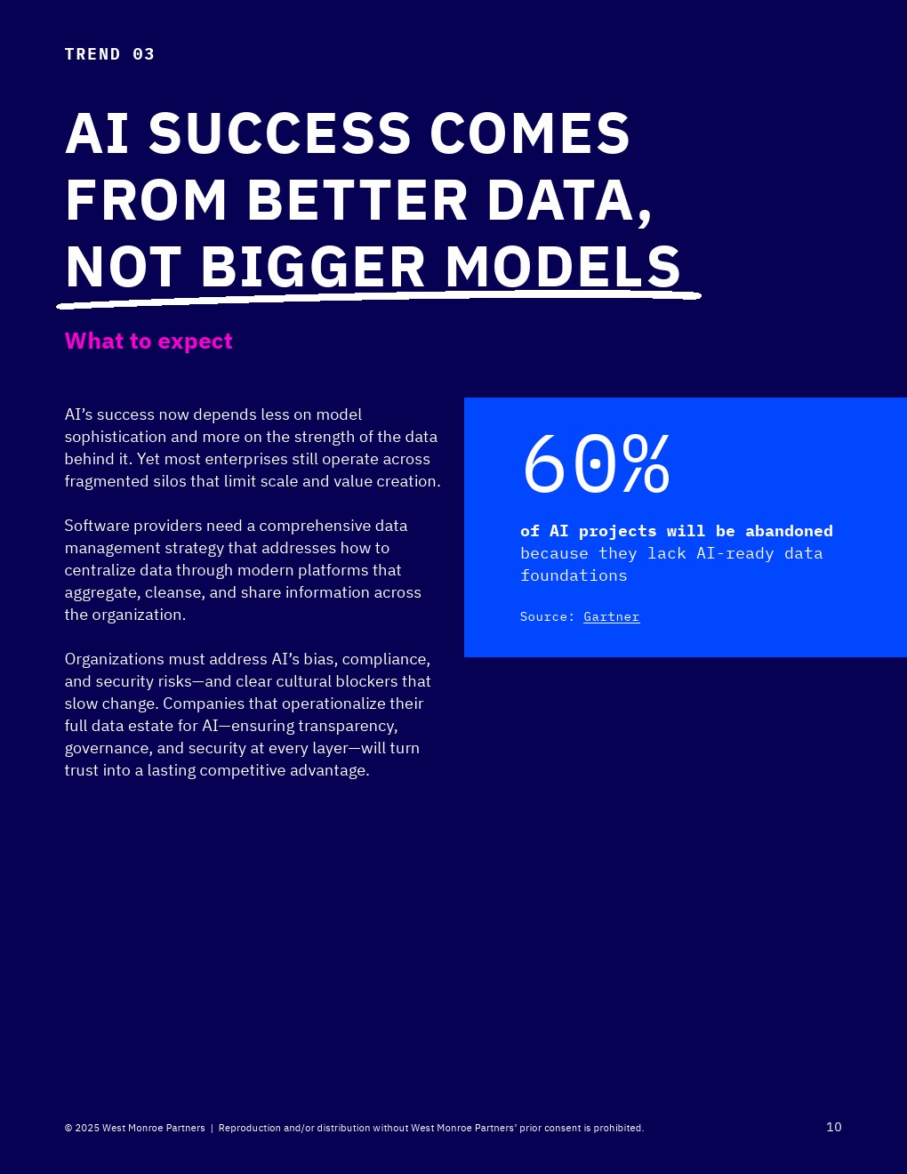 数据正成为AI时代最核心的竞争资产。约60%的AI项目因缺乏“AI就绪”的数据基础而被放弃,凸显数据治理的重要性。企业竞争优势不再来自模型能力,而是源于专有数据、数据质量及其可运营性。通过打破数据孤岛、建立统一平台并强化治理机制,企业能够将数据转化为持续复利的增长引擎,同时在合规与信任层面构建长期壁垒。