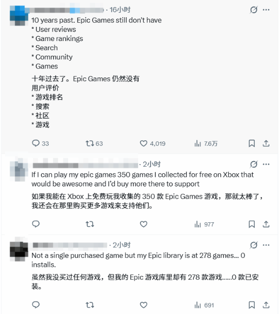 不少用户晒出自己的 EGS 游戏库,里面存了上百款免费领取的游戏,却从来没有下载安装过,连一款付费游戏都没买过;也有玩家吐槽,EGS 上不仅没什么值得购买的游戏,连打折活动都少得可怜,除了白嫖免费游戏,根本没有打开商店的理由;甚至有玩家表示,自己现在连免费游戏都懒得领了,完全没动力打开平台。