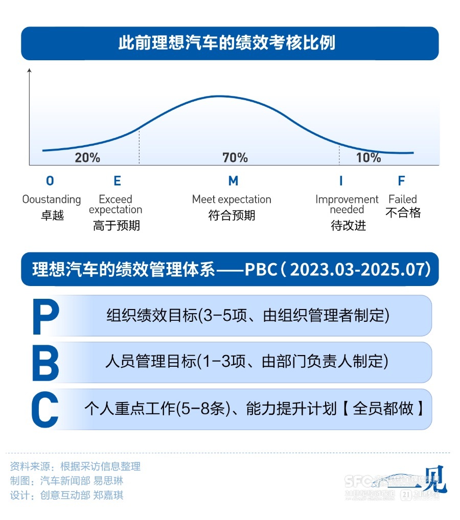 理想汽车也不例外。理想内部实行绩效等级制:员工的绩效被分为5个等级:“O”、“E”、“M”、“I”、“F”。在2023年3月之前,理想的考核周期是一季度一次、考核比例按照“262”进行划分,即考核周期内被评为“O/E”等级的员工占20%,被评为“M”的员工占60%,“I/F”占20%。