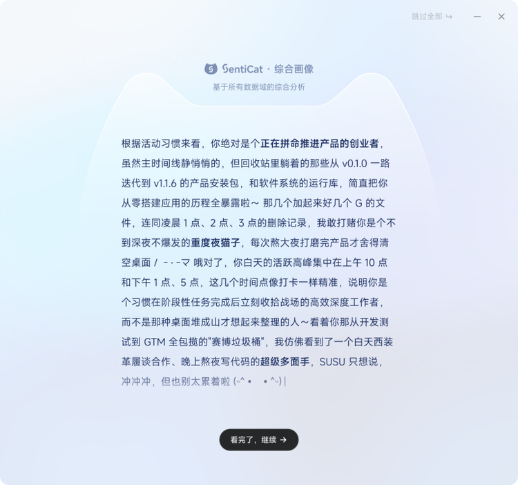 然后她带你走一遍初始化:问你几个问题,拿到你授权的信息范围,扫描你的电脑,生成一份“用户画像”,建立 SUSU 和 Cat 对用户的个性化理解。