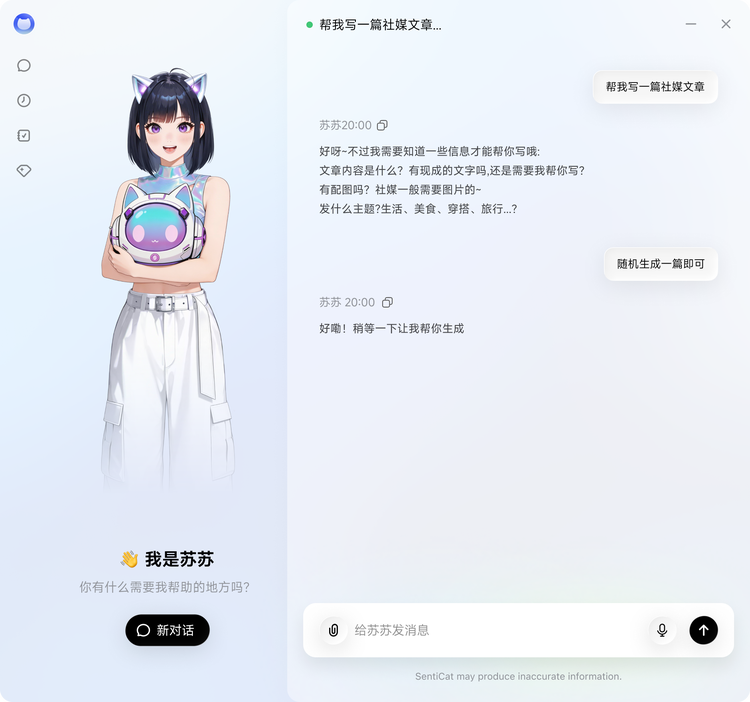 4 月 23 日,SentiPulse(思维光谱)公测了一款叫 SentiCat 的产品,把这套理念落了地。一个有 Live2D 形象、有性格的数字角色 SUSU,负责陪你聊天、了解你、跟你建立关系;她的“AI 小猫”,负责写 PPT、查资料、改代码,脏活累活归它。