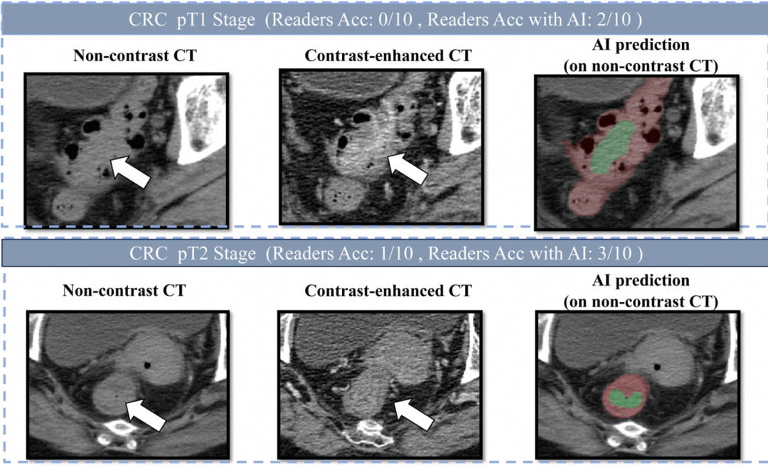 训练数据的构建更是一场硬仗。医生没法直接在平扫CT上标注肠癌——因为人眼看不清。团队的办法是:先请医生在增强CT(注射造影剂后对比度更高的影像)上精确勾画肿瘤位置,再通过图像配准技术"投射"到平扫CT上。