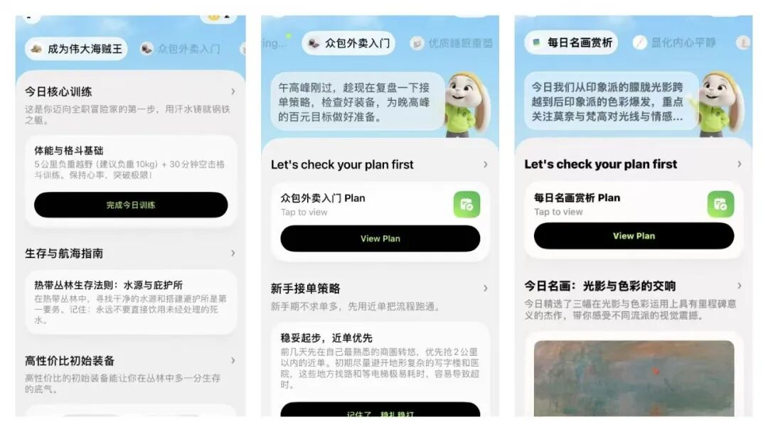 从这个原点出发,我们思考:从减肥到各种泛健康,这些领域背后都有一个「教练」角色可以被 Agent 化。我们始终在思考:现实生活中一个人怎么做好这件事,我们就应该努力让 Agent 像人一样做好这件事。