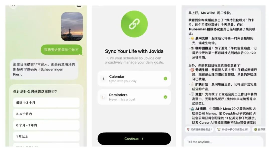 Jovida 的产品目标只有一句话:「Zero Friction from Desire to Action,从愿望到行动之间,零摩擦。」区别于以「自动完成任务、Agent 替代白领工作」为方向的 Agent Loop 路线,Jovida 想做的是「Agent in the Human Loop」,让 Agent 真正进入用户的生活。
