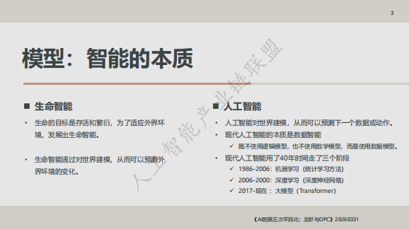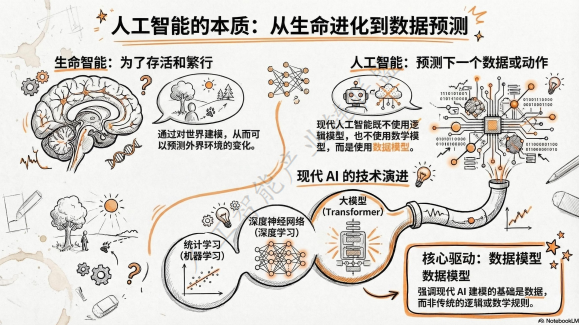 无论是生命还是机器,智能的核心都是对世界建模。生命为了存活和繁衍,通过建模预测环境变化;人工智能则通过数据模型预测下一个数据或动作。现代人工智能走了一条不同于逻辑模型和数学模型的路——数据模型。