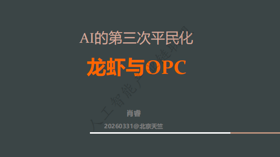 从ChatGPT到DeepSeek,再到今天的OpenClaw(龙虾),人工智能正经历第三次平民化浪潮。这一次,主角不再是聊天机器人,而是能替你干活的自主Agent。更关键的是,它催生了一种全新的组织形态——OPC(一人公司)。本文基于北京大学肖睿老师的最新分享,为你深度拆解“龙虾”与“OPC”背后的逻辑与实践。