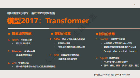 注意力机制是最基本的智能算子,让模型能够关注输入中最相关的部分。3. GPT:智能的公式