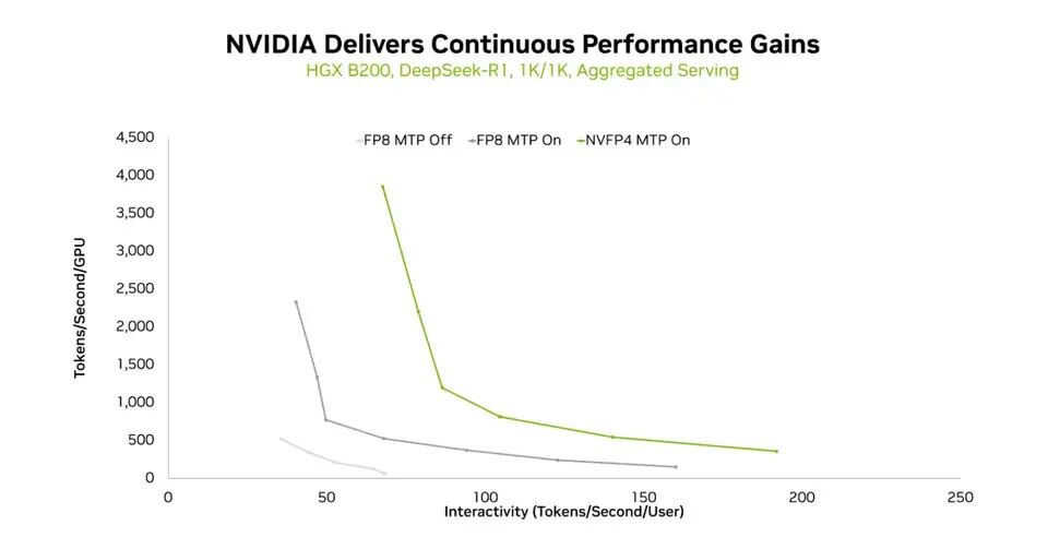 英伟达用一次纯软件升级,让AI推理性能“跃升”——在Blackwell架构GPU上,运行6710亿参数的稀疏MoE模型DeepSeek-R1时,单卡吞吐提升2.8倍,显著降低每token成本。