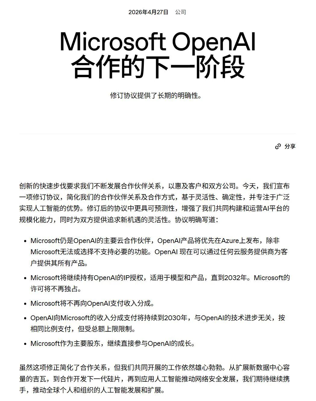 OpenAI与微软联合宣布重大合作修订:终结长达多年的独家分销权,OpenAI产品即日起可上架亚马逊AWS、谷歌云等所有主流云平台。此前,微软是其唯一云渠道;如今Azure仅保留“首发优先权”——新产品先上Azure,除非技术不支持。同时,微软对OpenAI的IP许可延至2032年,收入分成延续至2030年,并取消了“达成AGI即终止分成”的触发条款。