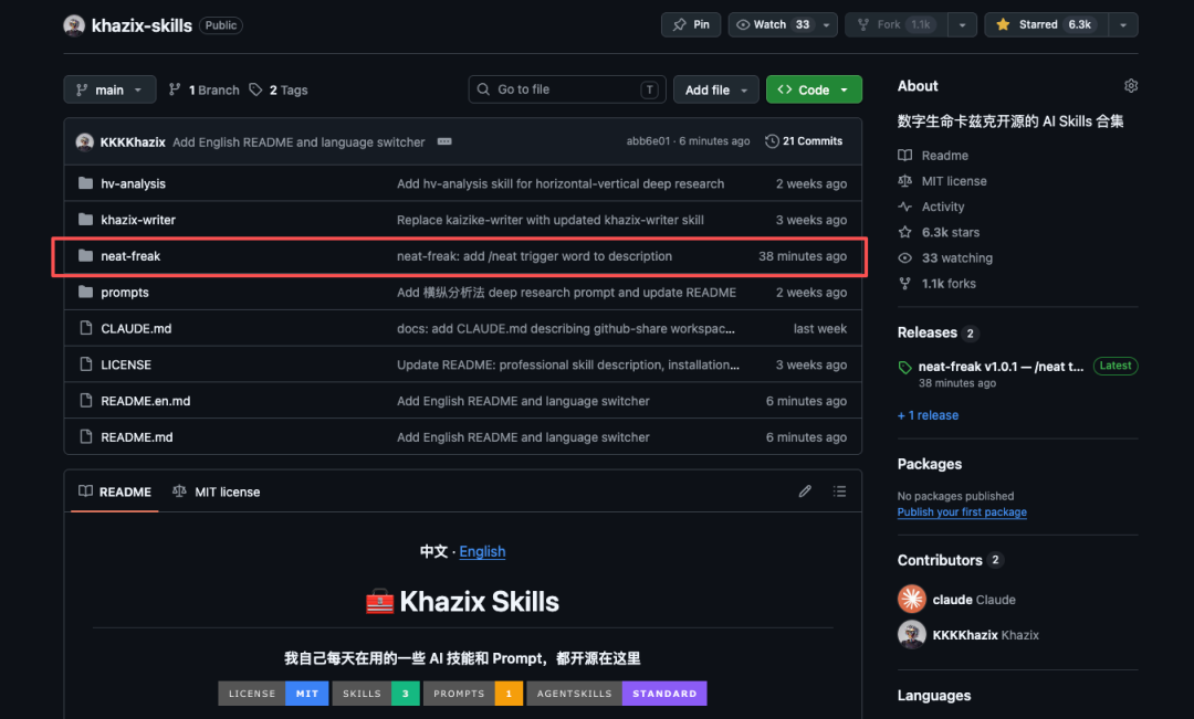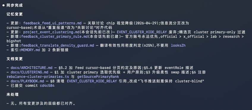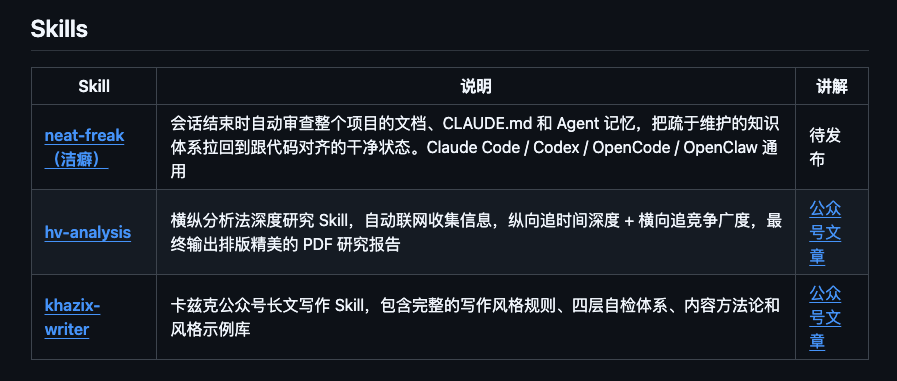 今天没选题了,所以想开源一个我自己做的,已经用了快1个多月,迭代了好多版的一个我觉得很有用的Skill。名字可能听着还挺呆逼的,但是我觉得它能干的事,虽然看着非常的简单,但是却又很实用,在公司内部同事和一些我们的合作伙伴使用后,还都反馈挺不错的。做的事大概就是,每次你在Agent里,做完一个功能或者又解决了一个BUG,就调用这个洁癖Skill,然后说一声帮我全面审查一下或者直接就/Neat一下,它就会自动审查你整个项目的文档体系和记忆文件,然后根据这次对话,把该改的文档、记忆、CLAUMD.md进行迭代,确保非常干净之后,最后,再给你一份变更摘要,让你知道改了啥东西。四个平台通用,Claude Code、Codex、OpenCode、OpenClaw都能装。相信我,这玩意会让你的Agent越来越聪明,也非常符合洁癖的定义。每次一个任务做完,要退出这个窗口的时候,如果不跑一遍/neat,我就浑身难受,如坐针毡如芒刺背如鲠在喉。如果你看过我之前写的那篇约束先行理念的文章,你大概能理解这种感觉。大家现在也都知道,在很多时候,你的Agent之所以越用越笨,其实是因为,你的上下文过于混乱。上下文不止是你跟你的Agent在单次对话中的聊天记录,也包括你这个项目里面的,各种文档,还有约束,还有记忆。但是其实很多的小伙伴,在用Agent的时候,比如CC和Codex去做一个项目,初期的文档规范倒是规划的挺好,但是每次迭代,每次更新,其实你会发现,这些文档和记忆,都是疏于维护,你可能代码都迭代了7、8轮了,新功能都上了无数了,但是你的文档,还是最开始的1.0.0版本的初始文档。其实不止Agent,很多公司内部项目的文档也都这样,前期雄心壮志,文档规范贼清晰,过两个月之后,规范?文档?你在说什么,我听不懂。我自己的项目里其实就出过这种事,就比如我做的AIHOT AI热点监控系统(PS:这个我最近会再打磨打磨降降成本,然后会免费向所有人开放,到时候也会发文章介绍,希望对大家有用。)光精选策略相关的功能就有乱七八糟的5、6个,一个信息抓到系统里,会需要十几个步骤进行数据清洗、加工、好几层评估等等,然后才会落库。现在每天处理的量级,在我严格挑选和管控信源的前提下,还是会有500多条信源产出的数据。然后我当时刚开始做的时候,其实想把整个项目后续封装成CLI,允许所有人的Agent都可以来浏览这上面的数据,能让大家用起来更方便,所以呢,我就把数据库从SQLite换成了PostgreSQL。但是这个切换其实工作量还是有点大的,当时用的还是Opus 4.6,时间一长的,真的就是顾头不顾尾,然后,搞完以后,文档啥的我忘记改了。结果后来我继续开发新功能的时候,Claude还在调用SQLite的语法,我当时还以为是模型啥的原因,搞了半天,发现是文档没改,包括我的CLAUDE.md里面,还赫然写着大概项目使用SQLite数据库这个意思。这种只是一个小摩擦,当你如果经历多了之后,你会发现,Agent很多时候犯的大多数莫名其妙的错误,根源其实都不是模型笨,是文档和记忆已经都脑腐了,都出现明显的混乱了。很多朋友可能会说,这不是专业开发者才需要关心的事吗?但是我想说,恰恰相反,很多我的专业开发者朋友都有自己的一套工程化习惯,git commit message写得规规矩矩,README随手就更新。真正被这个问题折磨最深的,反而是我们这些借助Agent来vibe coding的人,比如设计师、产品经理、内容创作者,当然也包括我自己。vibe coding前期特别爽,跟AI聊两句代码就出来了,功能也就跑起来了。但项目一旦做大,文档就不可避免地开始混乱,而且很多人也完全没有维护的概念,到最后就越来越混乱,你就会感觉到,我靠我的Agent怎么越来越笨。而这个维护,就是今天这个洁癖.skill,它要做的事情。之前Claude Code有一个功能叫AutoDream,也就是做梦,我也写过文章:Claude Code悄悄学会了做梦,我当时挺兴奋的,因为这玩意感觉就是我想要的东西?
