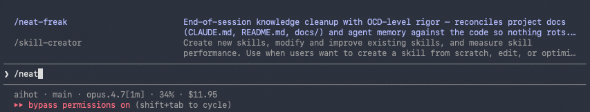 这五步看着麻烦,其实就是skill自己的过程,你根本不用管,你要做的,就是运行一下这个skill。我自己一般在所有任务的收尾,都必定会运行一下/neat。我把洁癖.skill一般当类似于游戏的存档机制用,这次要结束了,要存档了,就运行一下/neat,然后,下次打开一个新的会话,还可以接着来。说实话,洁癖这个东西看起来只是在整理文档,但它真正解决的问题我觉得比整理文档有用的多。它会让你的知识体系从依赖对话上下文变成了依赖持久化文档,也就是说,对话可以随时关,但文档,永远在。因为上下文腐败问题,所以其实大家都懂,一个对话里,信息越多模型能力越差,然后再Claude里,虽然Opus 4.7说有1M上下文,但是我测试的时候,经常到了500K左右就有点不对劲了,所以我现在几乎是选择在400K左右进行一次整理并存档,然后新开窗口了。新开窗口以后,因为文档和记忆管理的足够好,所以你几乎不需要给任何提示,有任何问题直接说就行,Agent都能非常精准的给你解决,解决完了你继续/neat进行存档,你会发现,真的就是,越用越聪明。这个skill最近让公司同事和几个合作企业的朋友试了一下,大家居然意外的说挺好用的。过期的就删,重复的就合,模糊的就改。