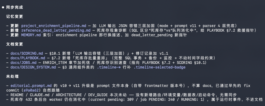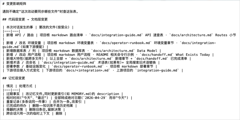 里面最核心的原则,其实就是合并优于追加,删除优于保留。这个跟大多数人的直觉是反的,因为很多时候,大家会觉得,信息多总比信息少好吧?万一以后用得上呢?但其实在AI协作的场景里,信息多不是优势,信息准才是,坦率的讲,一条过期的记忆,比没有记忆更糟糕,因为没有记忆的时候,AI至少知道自己不知道,它会问你。但如果它读到了一条过期的信息,它会以为那是对的,然后基于错误的前提做事。OpenClaw越用越笨,就是它的记忆系统实在是过于臃肿了。而当你安装了洁癖.skill,每次跑洁癖.skill的时候,它会按顺序做五件事。第一步,就是先强制机械式盘点。把项目里所有的md文件全列出来,每一个都读一遍,都不要漏掉,因为之前遇到过好几次,你看着是给你改了,结果哎就给你漏了那么一个文档,关键还是贼关键的。第二步,用我的变更影响矩阵文档去识别一下需要改什么。不只看对话里有什么新事实,也要去看新事实会波及哪些文档层级。然后这一步还有一个关键检查,这次对话是不是跨项目的?如果改了项目A而项目B依赖它,那项目B的docs也得跟着改,这个其实是历次同步最常翻的车。第三步,直接改,这里有一个顺序步骤,先改docs/,再改CLAUDE.md,最后整理记忆。第四步,自检清单,基本是我的skill里面的老演员了,必然都会有自检清单,就比如新增的环境变量,在runbook和CLAUDE.md都出现了吗?有没有相对时间遗留等等之类的东西,确认一遍。