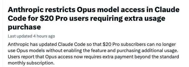 几乎同一时间,Anthropic 限制了 Claude Code 中 Opus 模型的访问,每月 20 美元的 Pro 用户想继续用?请额外付费。