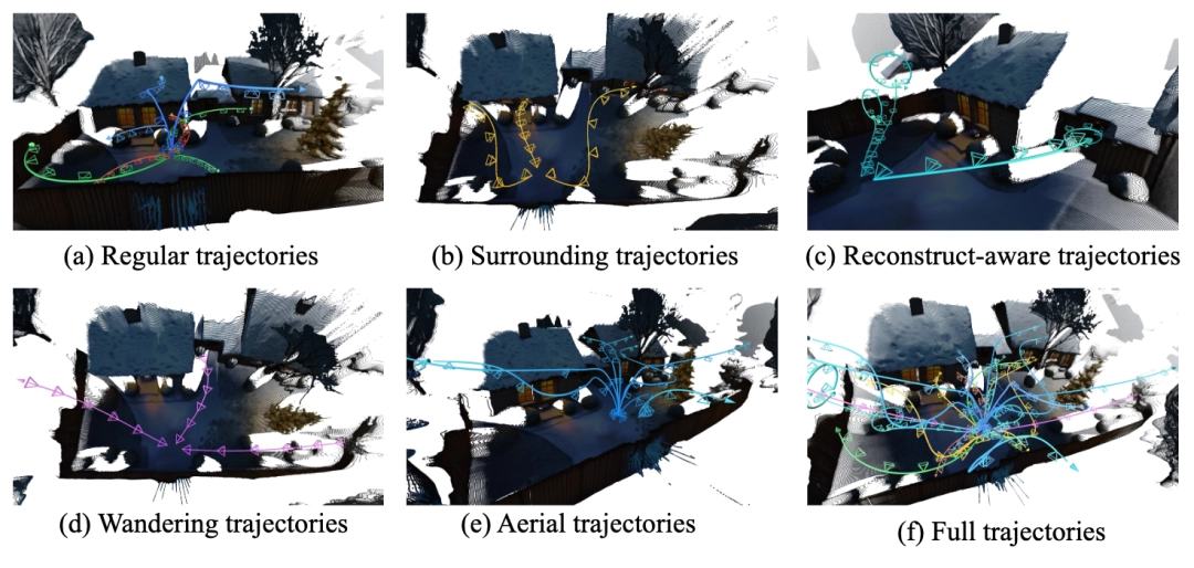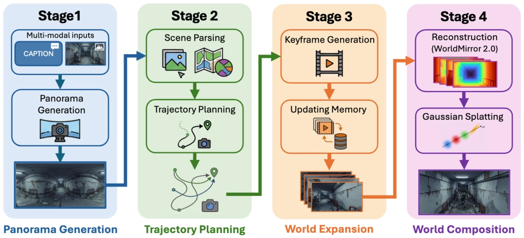 。模型会根据每个场景的不同语义,规划出“环绕物体”、“最大漫游”等五类运镜轨迹,这样搭配下一步的世界扩展模型,可以让用户在 3D 世界中的探索路径既自然又有趣。
