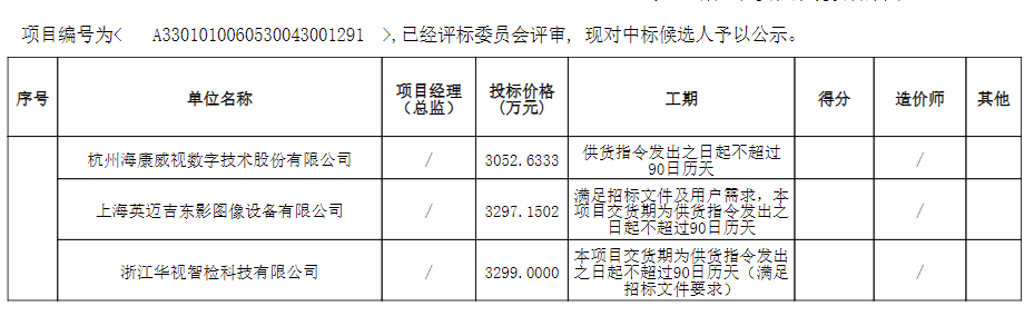 经评审,杭州海康威视数字技术股份有限公司、上海英迈吉东影图像设备有限公司、浙江华视智检科技有限公司成为项目中标候选人。从报价来看,三家报价都不是很高,海康威视报价3052.6333万元,英迈吉东影图像设备公司报价3297.1502万元,华视智检科技公司报价3299万元。
