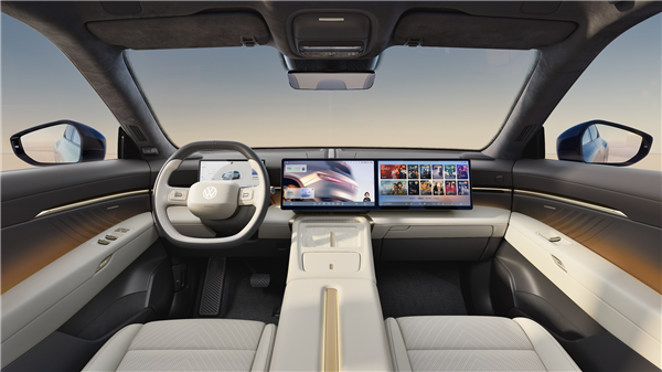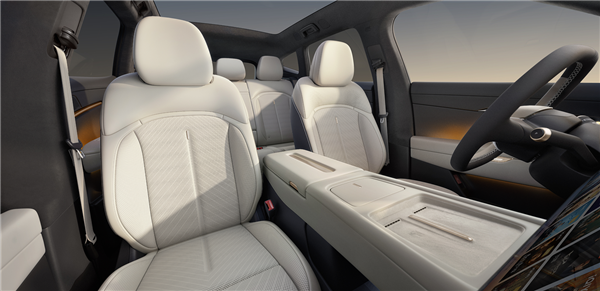 新车内饰采用环抱式座舱设计,车内95%区域采用亲肤面料软质包裹,有三款内饰颜色主题可选,还能选装Nappa真皮与麂皮绒顶棚。