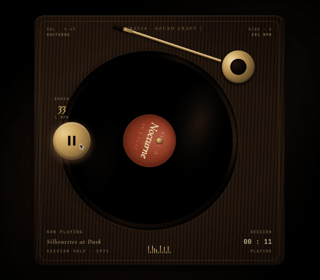 第一个场景,是让它做一个俯视视角的黑胶唱片机界面,其难点在于「金属光泽」与「呼吸光晕」的呈现。4.7 并没有用廉价的色彩渐变敷衍了事,而是通过复杂的 CSS 样式叠加,逼真地还原了金属质感。