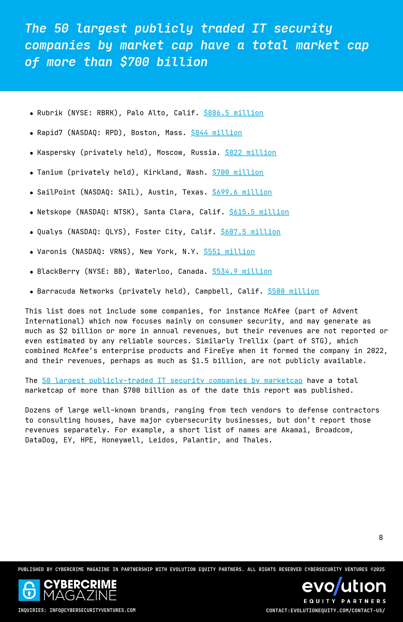 供给侧呈现高度集中与长尾并存格局。微软2025年安全收入约370亿美元,占总收入14%,头部科技公司持续加码投资。 但纯网络安全公司中,仅约15家年收入超过10亿美元,行业整体仍高度分散,同时前50家上市公司市值已超过7000亿美元。