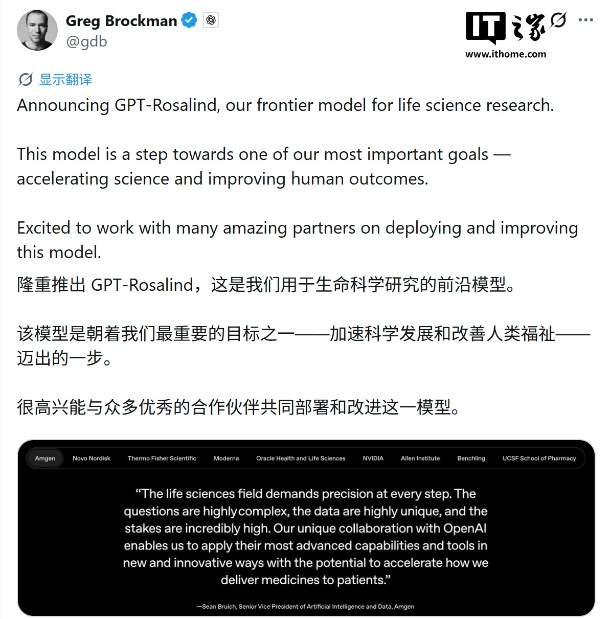OpenAI 联合创始人 Greg Brockman 表示,GPT-Rosalind 是 OpenAI 用于生命科学研究的前沿模型,朝着加速科学发展和改善人类福祉这个目标迈进。