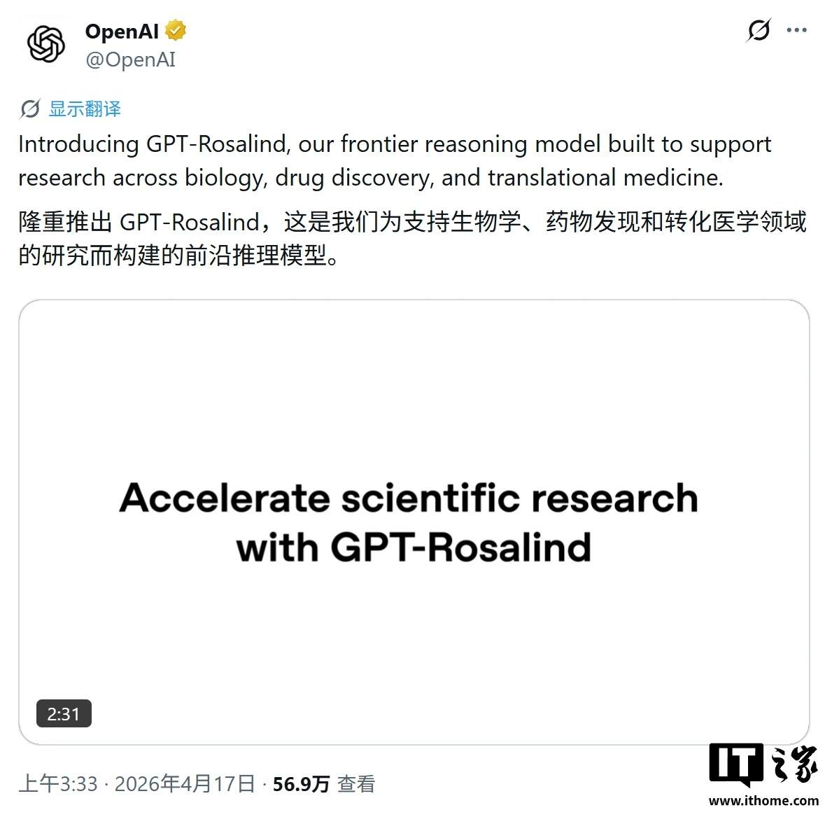 4 月 17 日消息,OpenAI 周四宣布推出 GPT-Rosalind,
