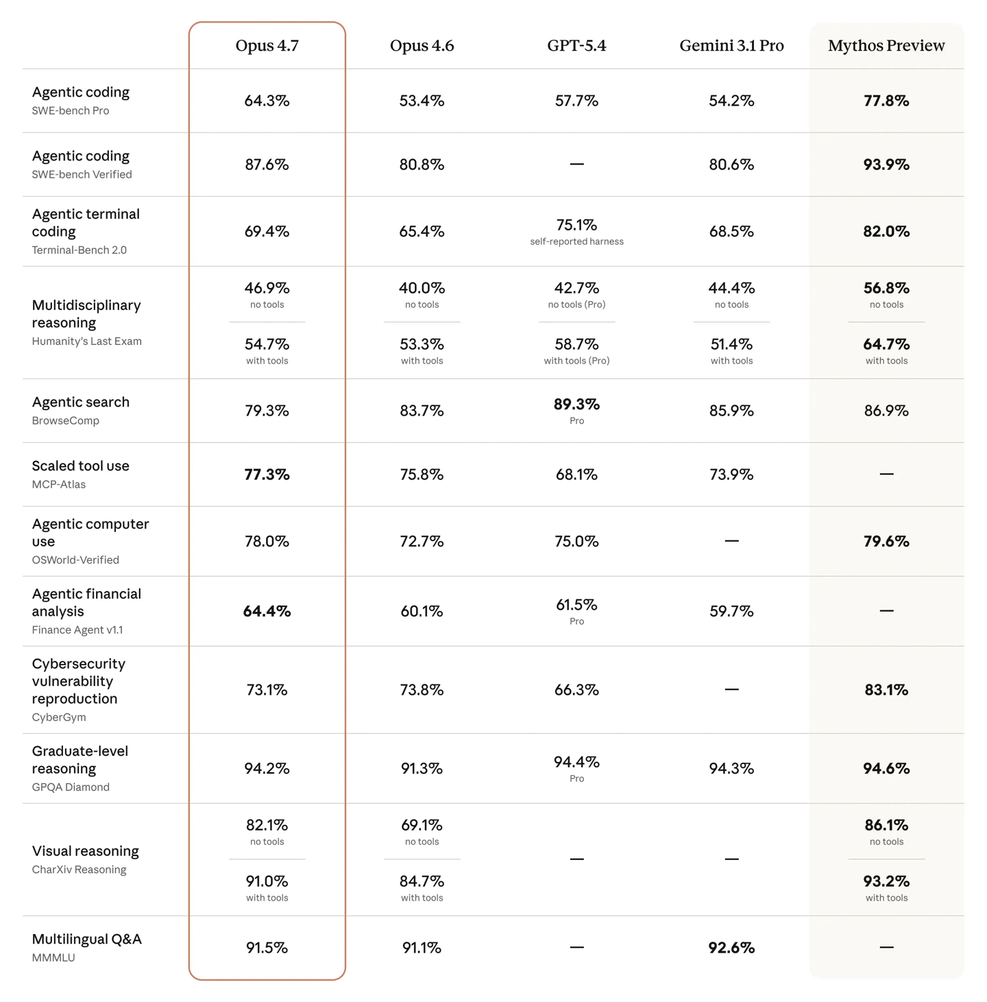 在智能体编码、计算机操作等多项应用场景的基准测试中,Opus 4.7 表现亮眼,性能超越了 Opus 4.6、GPT-5.4 以及 Gemini 3.1 Pro,但略逊于能力更全面的 Claude Mythos Preview。不过 Mythos 并未像 Opus 4.7 这样全面开放使用,目前 Anthropic 仅向苹果等核心软件平台厂商提供该版本。