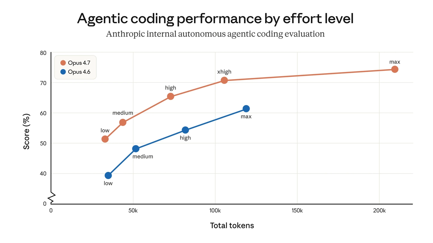 2. 在高算力模式下,Opus 4.7 的“思考”更充分,尤其在智能体场景的后续交互中。这提升了复杂问题的解决可靠性,但也意味着会产生更多输出 Token。
