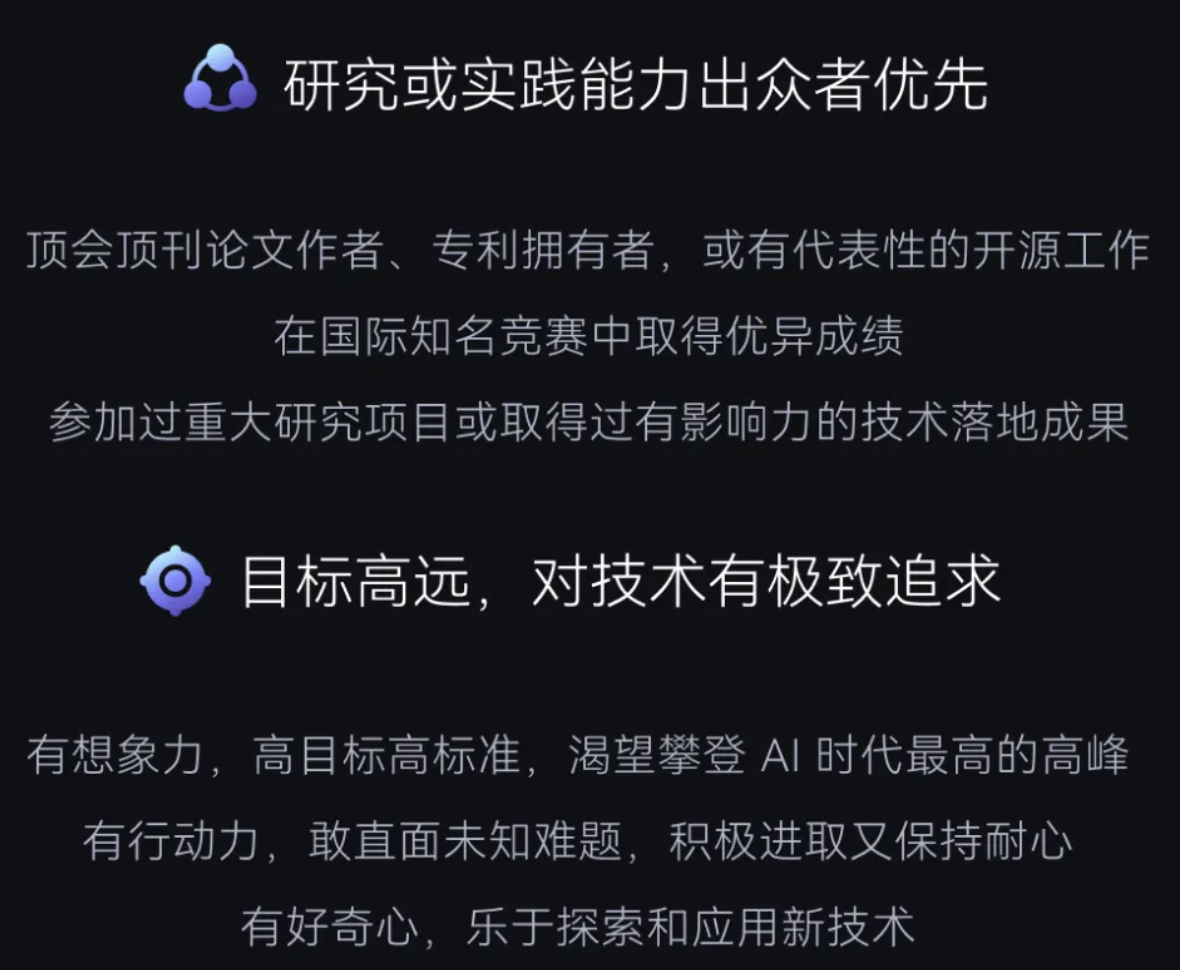 字节方面特别强调,凡是顶会顶刊论文作者、专利拥有者,或有代表性的开源工作,以及在国际知名竞赛中取得优异成绩、参加过重大研究项目或取得过有影响力的技术落地成果的人才会优先选用。