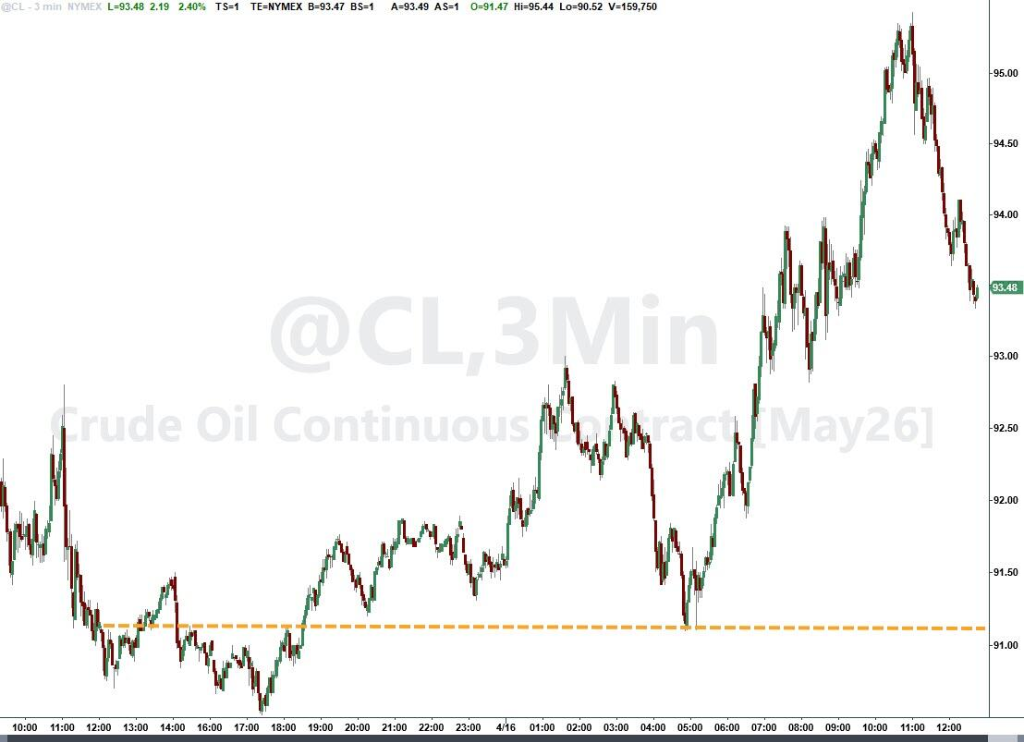 原油震荡走高,最终美油日内一度上涨5%,随后快速回落。布伦特6月原油期货收报99.39美元/桶。