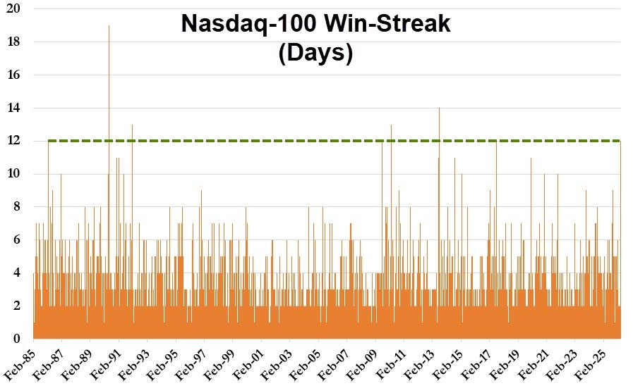 (纳斯达克100指数创2017年7月以来最长连涨纪录)
