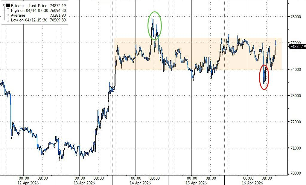 比特币下探7.3万美元后反弹,在7.55万美元遇阻,最终微涨0.1%;以太坊几乎持平。