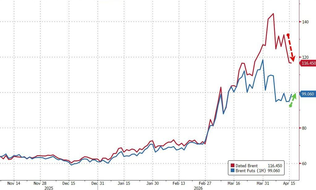 (红线即期布伦特油价下跌,蓝线布油期货价格上涨)