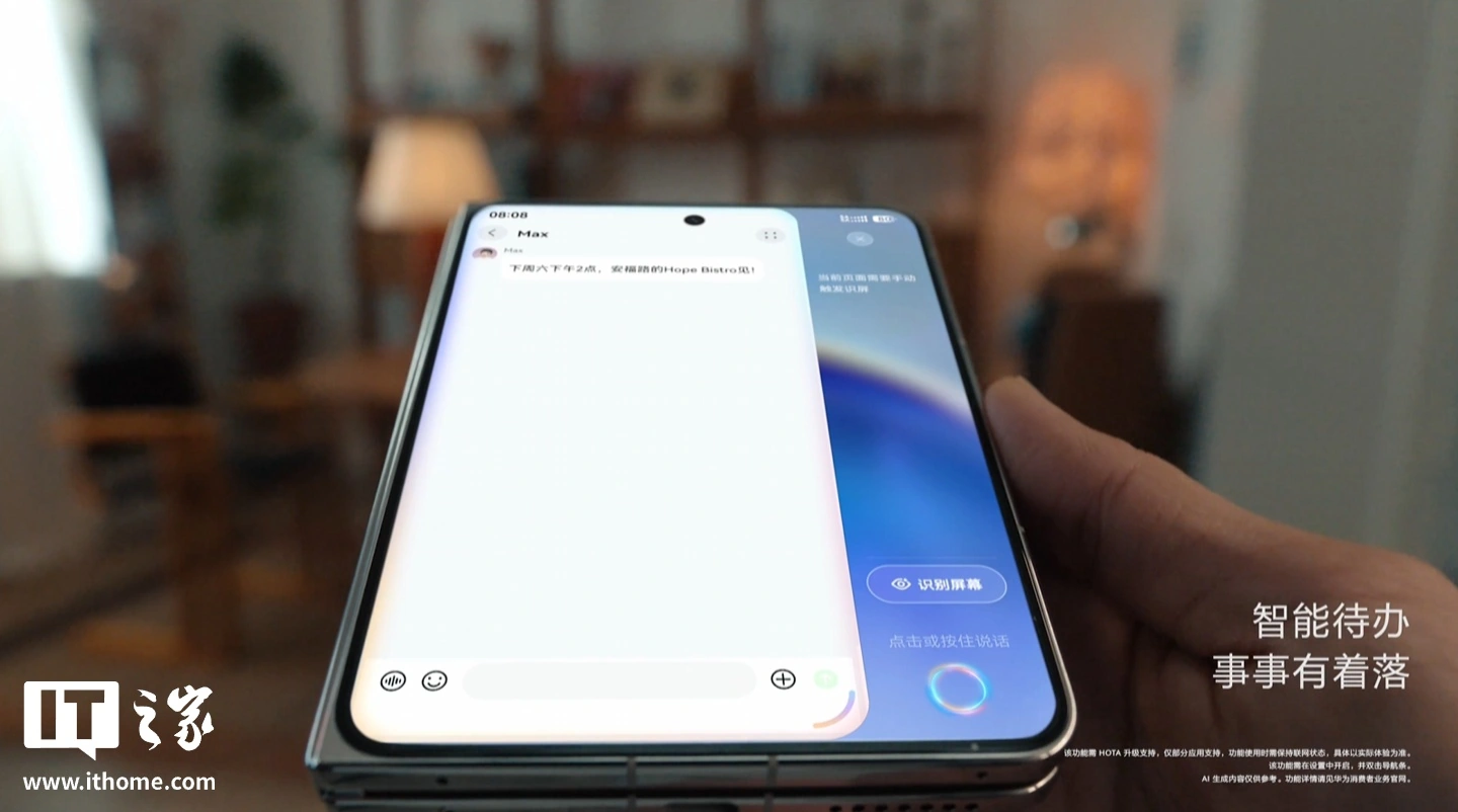 6.1 版本的功能。根据官方预热视频的注释来看,该功能目前已适配部分应用,但需后续 HOTA 支持,并保持联网状态方可使用。另外,使用全新小艺伴随式 AI 前需要先在设置中开启,后续可通过双击导航条(屏幕底部小白条)唤起。