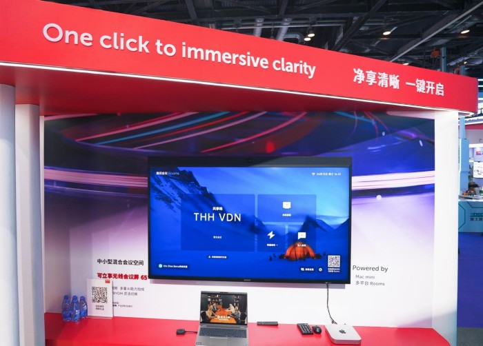 中小型混合会议空间展现两款高效方案,65英寸可立享无线会议屏与Mac mini组成的国产Rooms一体化解决方案,帮助用户更加方便高效的使用Rooms系统开会;可立享Hub模块化无线视频会议室系统与65英寸可立享无线会议屏,可以让Teams Rooms用户通过一体化集成方案高效开展视频会议。
