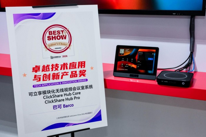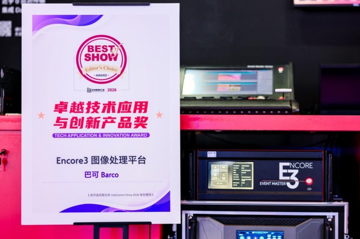 展会期间,巴可荣获本届InfoComm China 2026的“Best of Show”奖项。可立享Hub模块化无线视频会议室系统、Encore3图像处理平台两款重磅产品,凭借领先的技术应用与创新性,一举斩获卓越技术应用与创新产品奖。